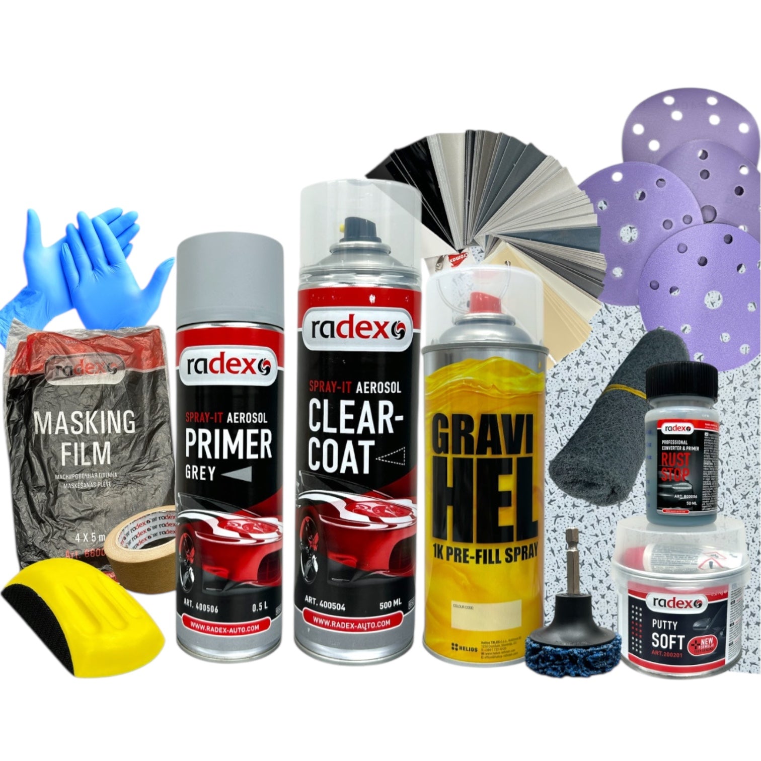 Īsumā komplekts iekļauj visu nepieciešamo, lai mājas apstākļos novērstu rūsu, izbalējušu krāsu, skrāpējumus, un citas virsbūves nepilnības.