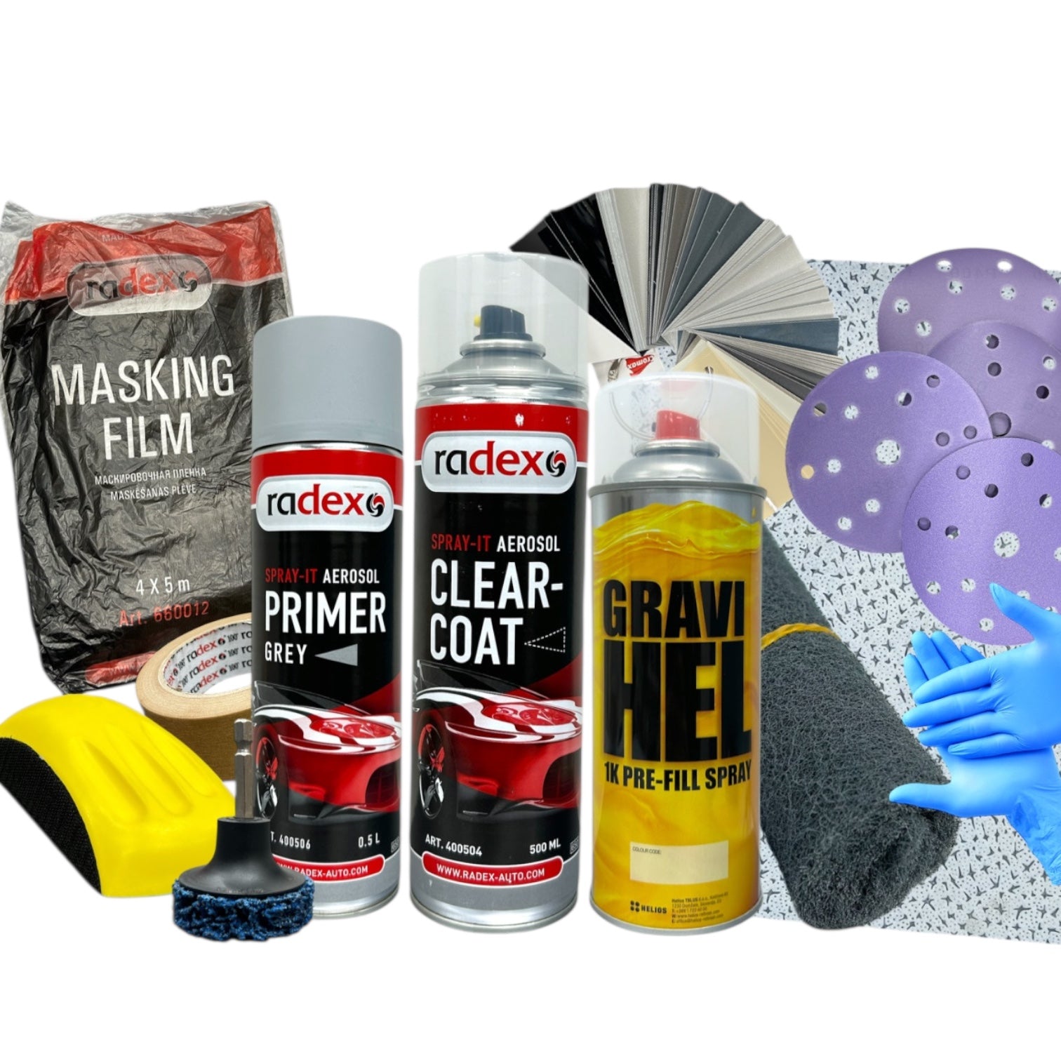 Īsumā komplekts iekļauj visu nepieciešamo, lai mājas apstākļos novērstu rūsu, izbalējušu krāsu, skrāpējumus, un citas virsbūves nepilnības.